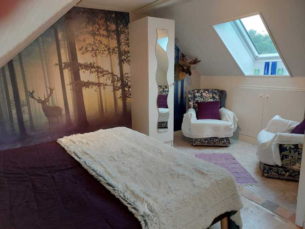 Für wen eine Ferienwohnung auf unserem Hof zu groß ist, kann bei uns auch nur ein Zimmer mieten. Davon befinden sich drei im OG des Seminarhauses mit einem WC auf dem Flur und Duschen im Keller. Es können alle Gemeinschaftsräume wie Kreativraum mit Firestick-TV, Leseecke mit Bibliothek, Küche, Veranda, Sitzecke vorm Haus und Lagerfeuerplatz genutzt werden. Freies Wlan.
